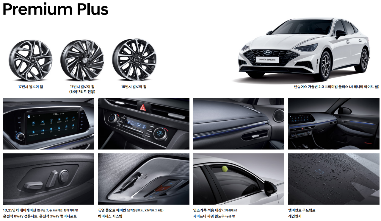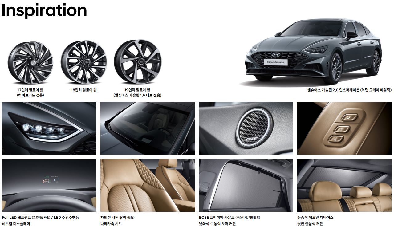 쏘나타 하이브리드 인기 옵션은 각 트림별로 살펴보면 모던에서는 하이패스 시스템 + ECM 룸미러를 가장 많이 선택했고 그 다음이 현대 스마트 센스, 인포테인먼트 내비 II를 선택했습니다. 프리미엄 플러스 에서는 컴포트 I(앞 좌석 편의)를 가장 많이 선택했고 그다음이 클러스터(12.3인치 컬러 LCD), 플래티넘 순으로 많이 선택했습니다. 인스퍼레이션에서는 나파가죽 시트를 가장 많이 선택했고, 그다음이 BOSE 프리미엄 사운드, 18인치 알로이 휠 & 피렐리 타이어를 선택했습니다.