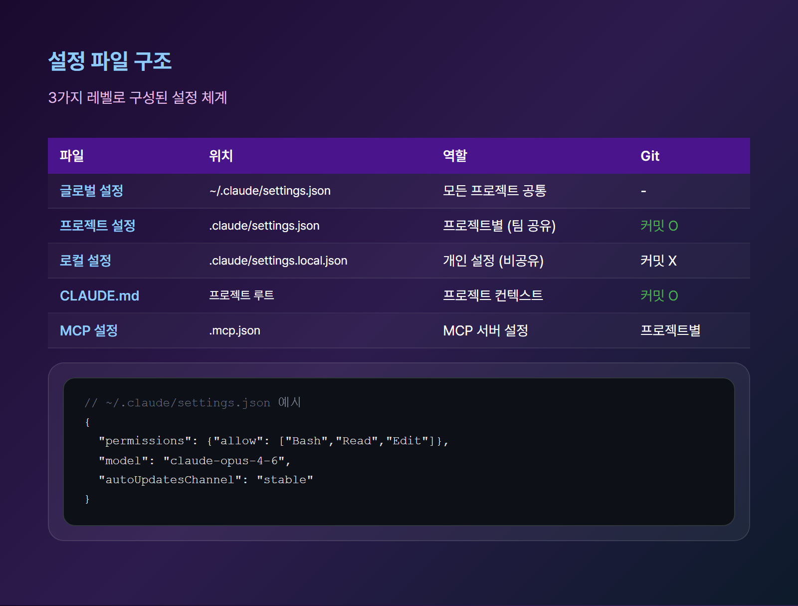 프로젝트 settings.json은 팀원과 공유할 수 있어, 팀 전체가 동일한 권한 설정을 사용할 수 있습니다.
