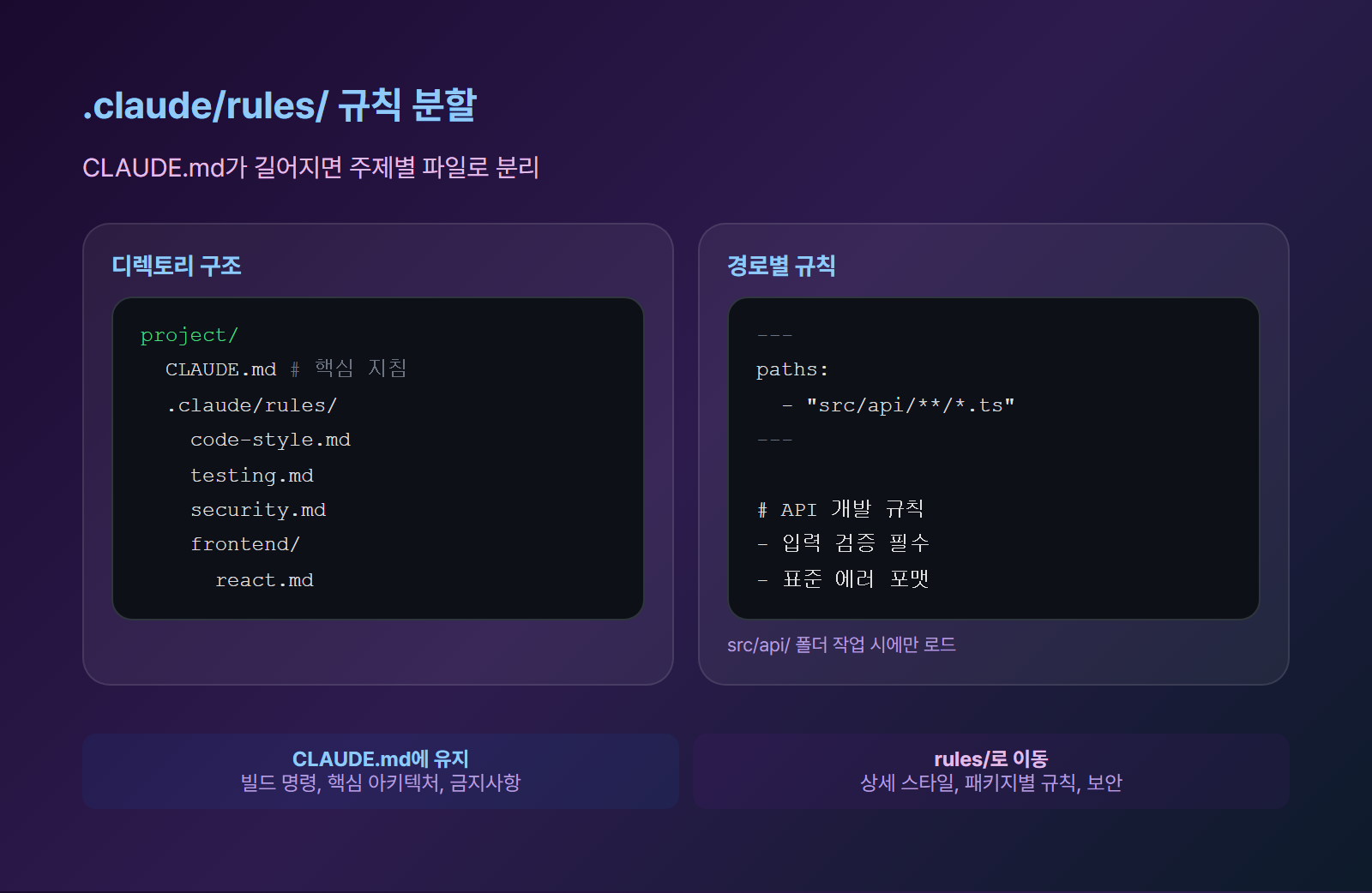 | 자주 변하는 정보 | 유지보수 부담 | .claude/rules/ 분리 |