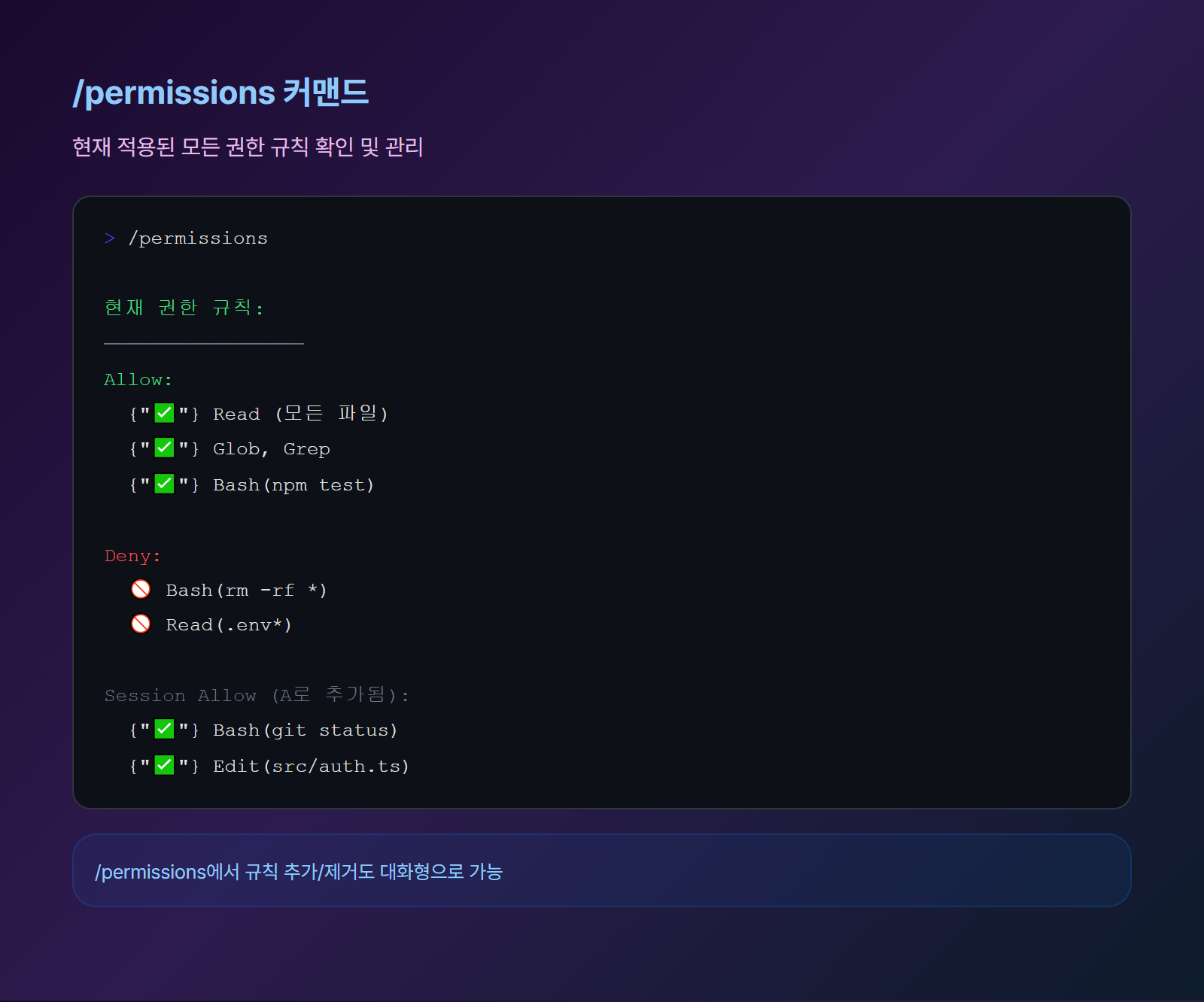 Claude Code의 권한 시스템은 Claude가 어떤 도구를 어떤 조건에서 사용할 수 있는지 제어하는 메커니즘입니다.