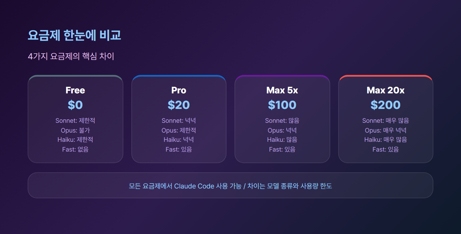 - Free: 체험용, Sonnet/Haiku만, 사용량 제한적