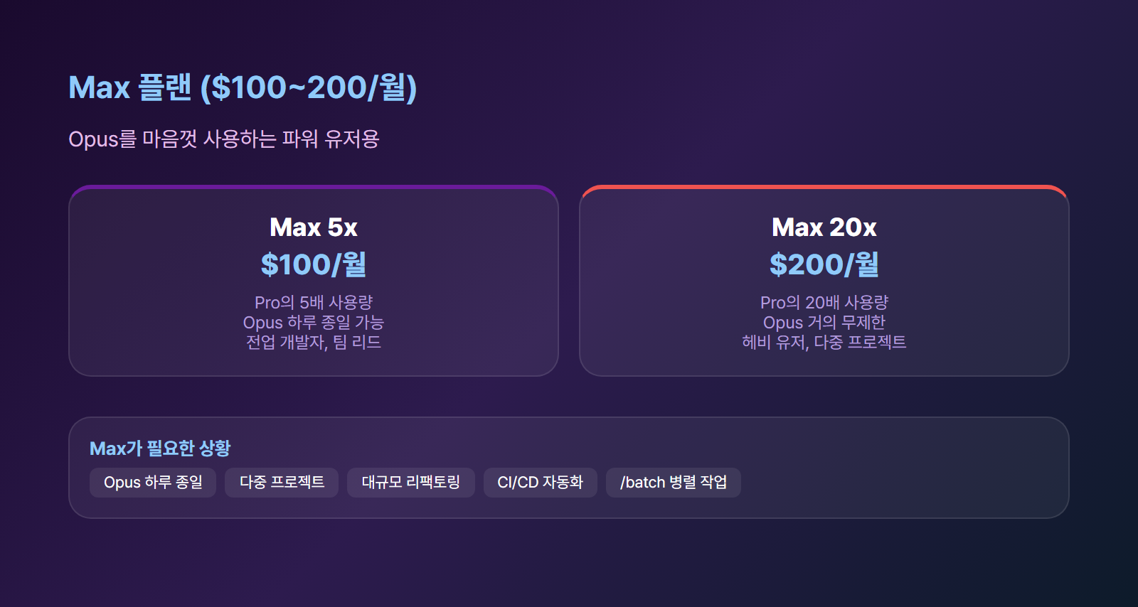 - Max ($100~200): Opus 풀 사용, 대규모 프로젝트, 팀 작업