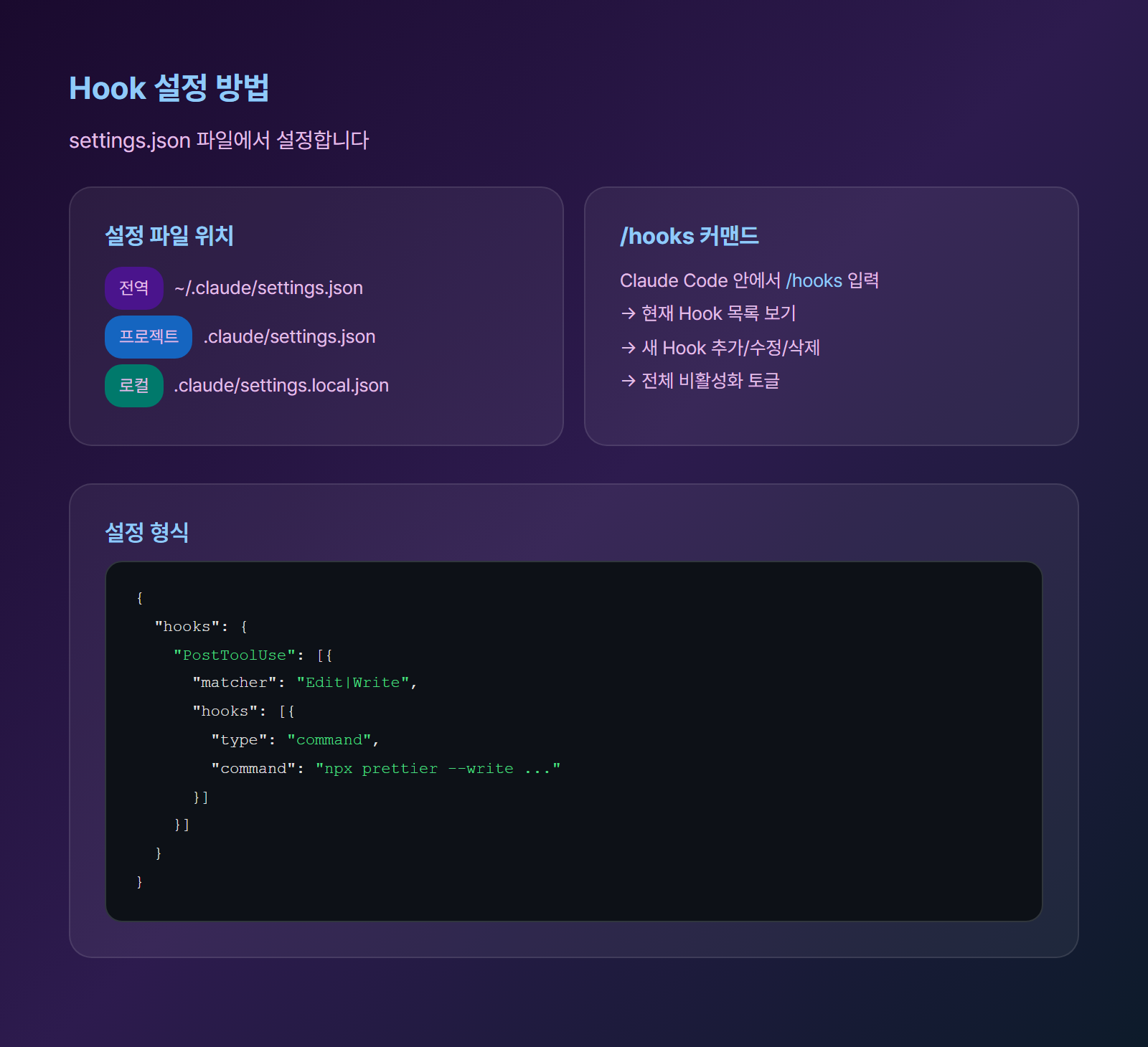 Hook은 settings.json 파일에서 설정합니다.
