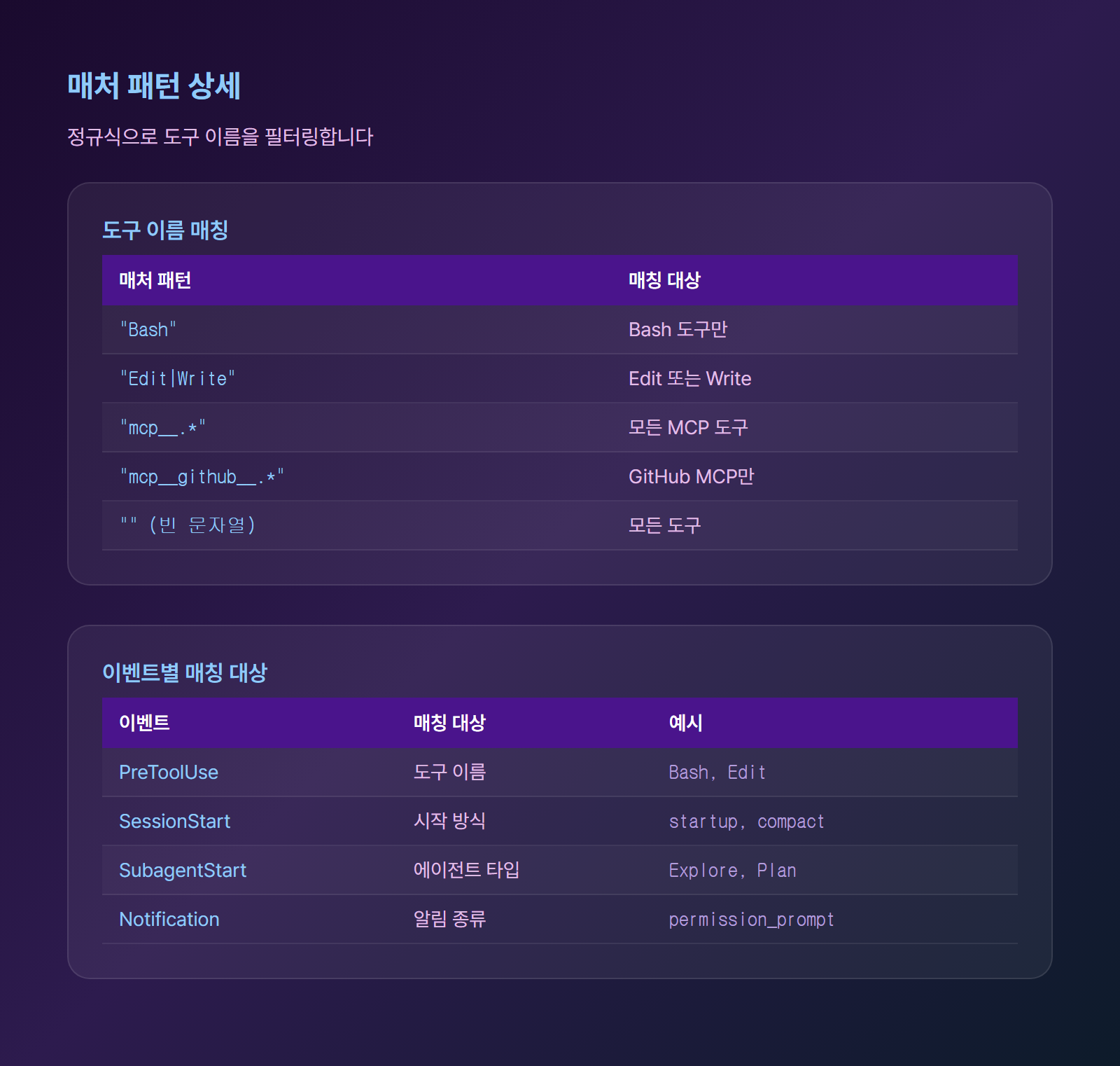 | SubagentStart | 에이전트 타입 | "Explore", "Plan" |