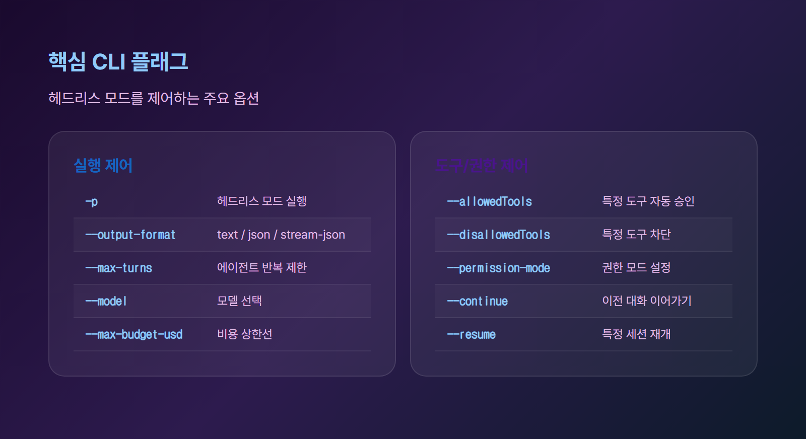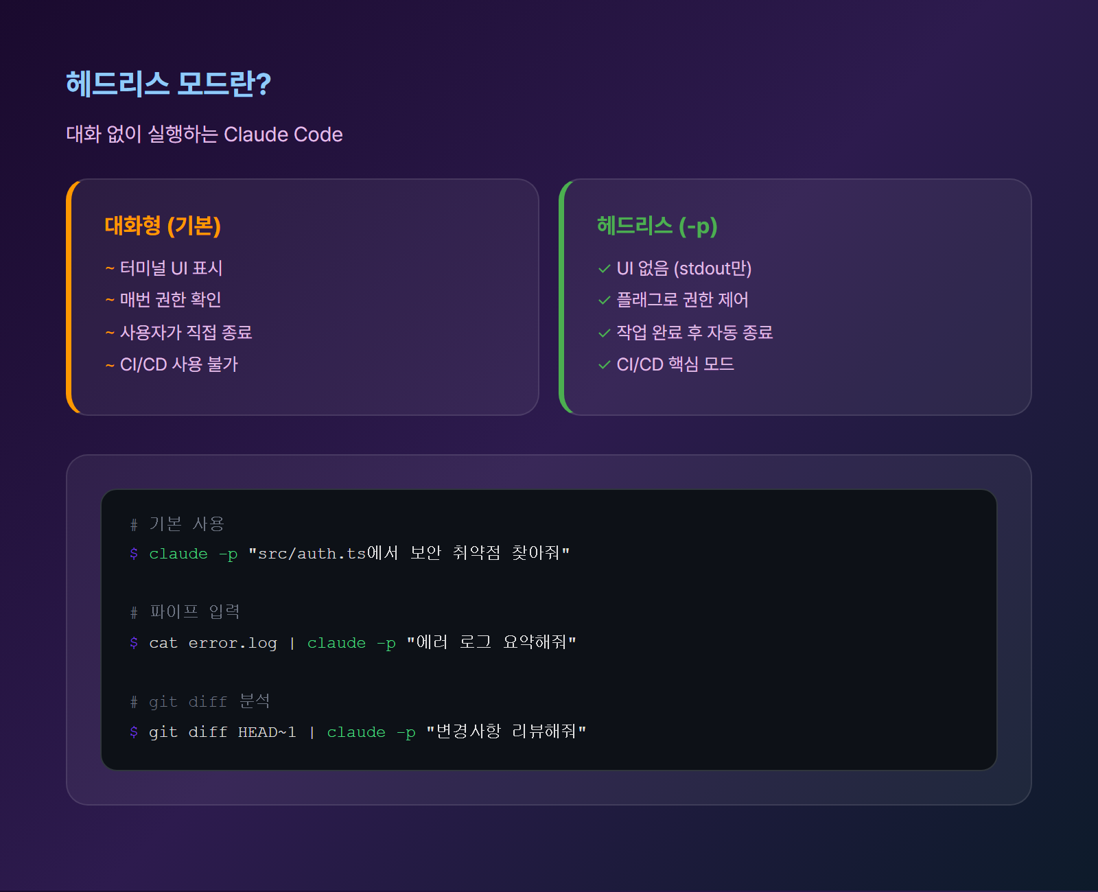 헤드리스 모드(-p 플래그)는 Claude Code를 비대화형으로 실행합니다. 프롬프트를 받고, 작업을 수행하고, 결과를 stdout으로 출력한 뒤 종료합니다. 스크립트나 CI/CD 파이프라인에서 사용하기 위한 핵심 기능입니다.