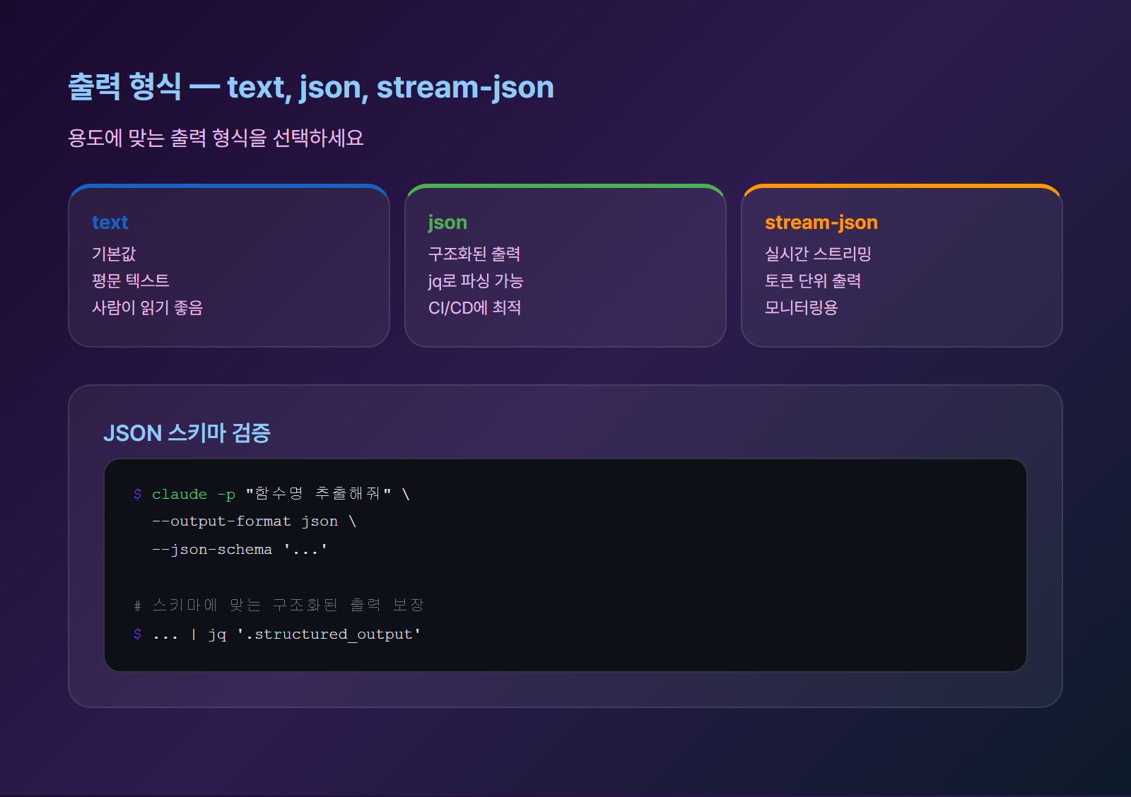출력 형식 (text/json/stream-json) | claude -p "질문" --output-format json |