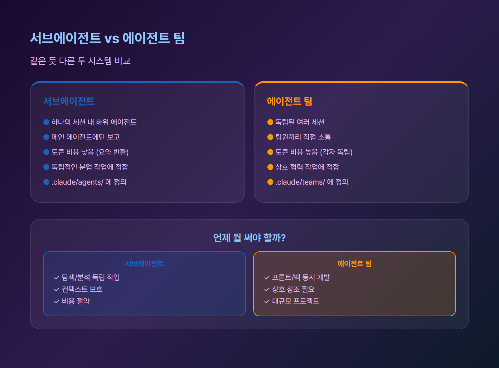 | 항목 | 서브에이전트 | 에이전트 팀 |