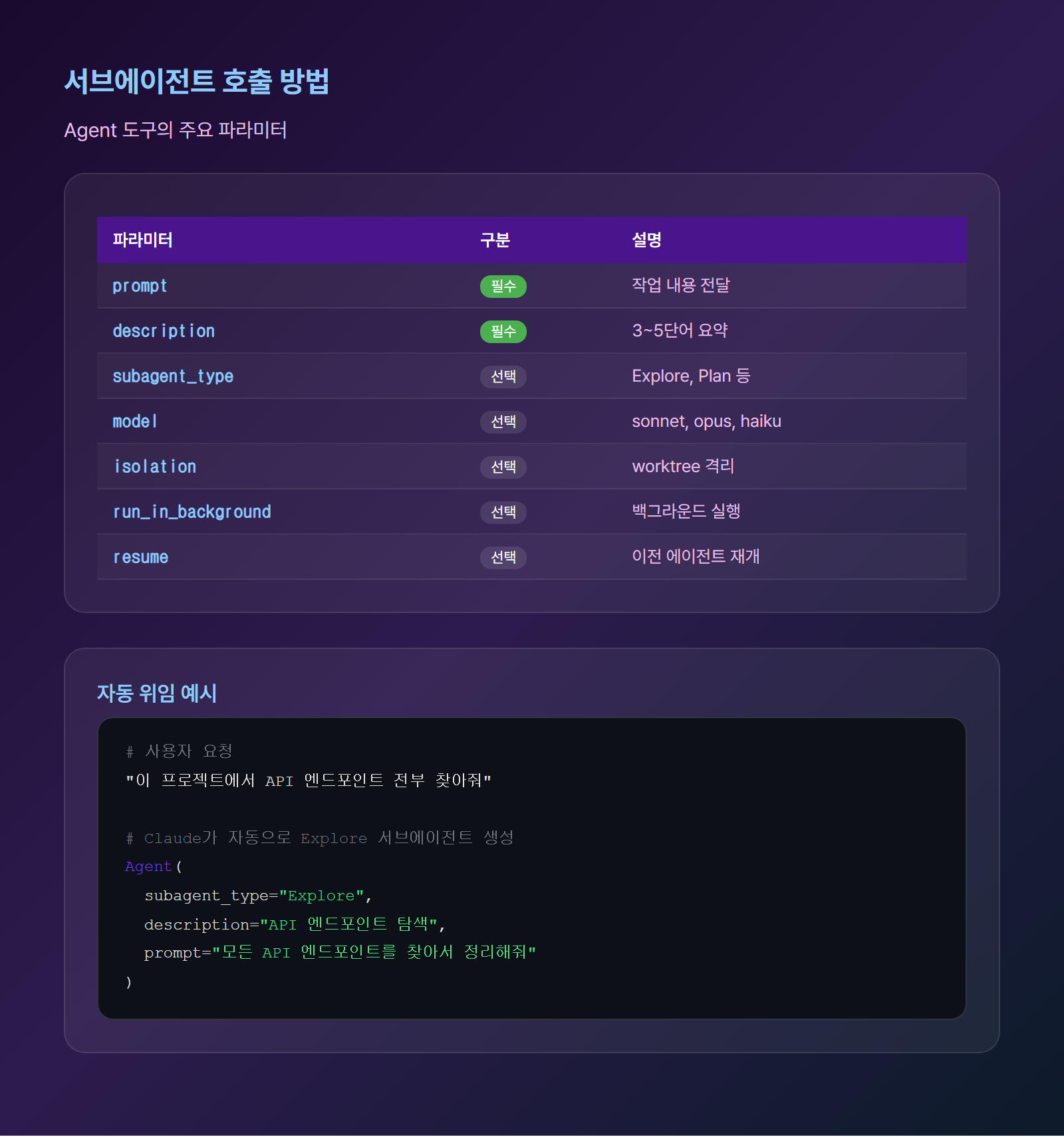핵심 이점: 메인 대화의 컨텍스트 윈도우를 깨끗하게 유지하면서, 복잡한 작업을 병렬로 처리할 수 있습니다.