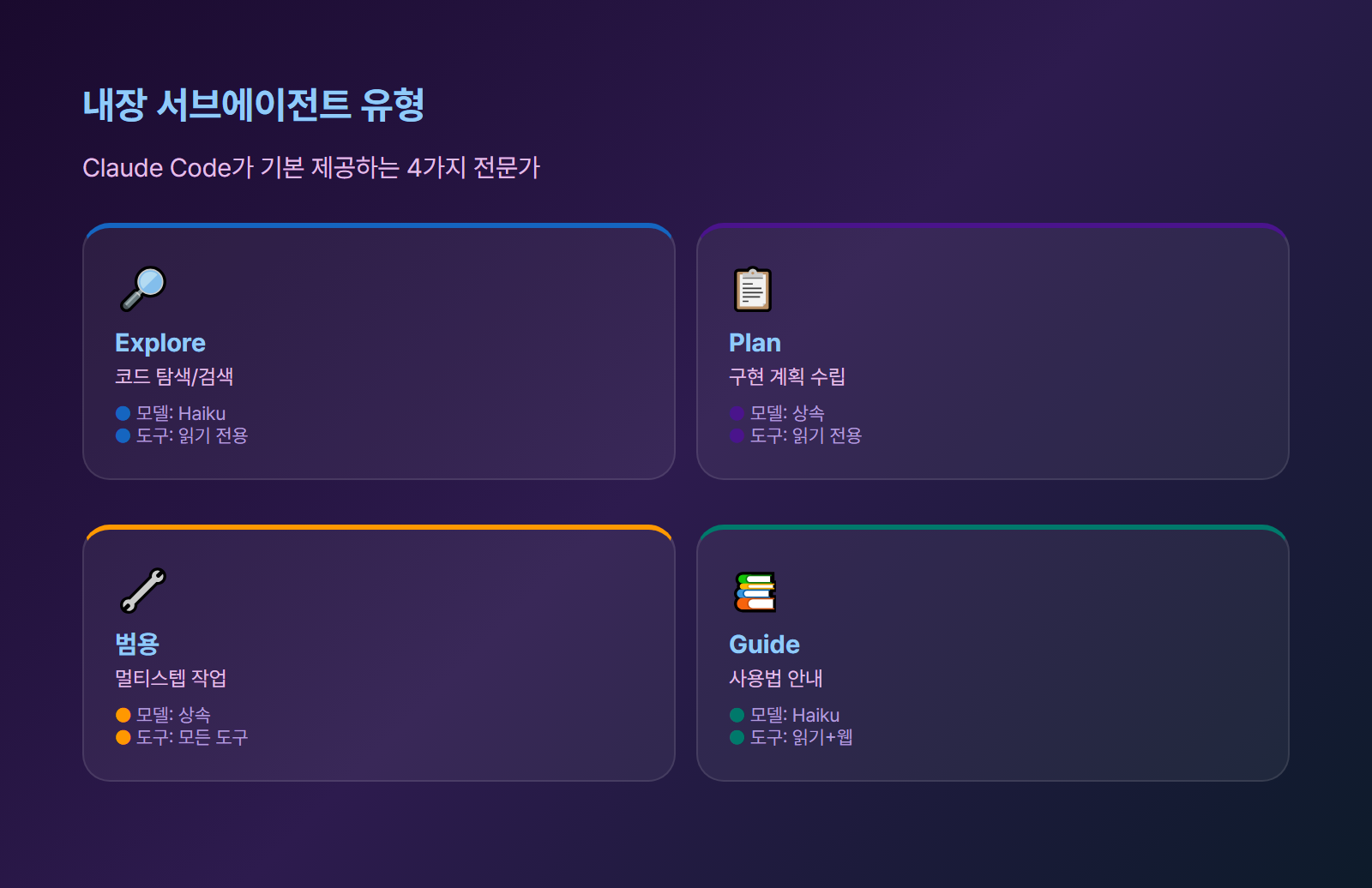 Claude Code에는 바로 사용할 수 있는 내장 서브에이전트가 있습니다.