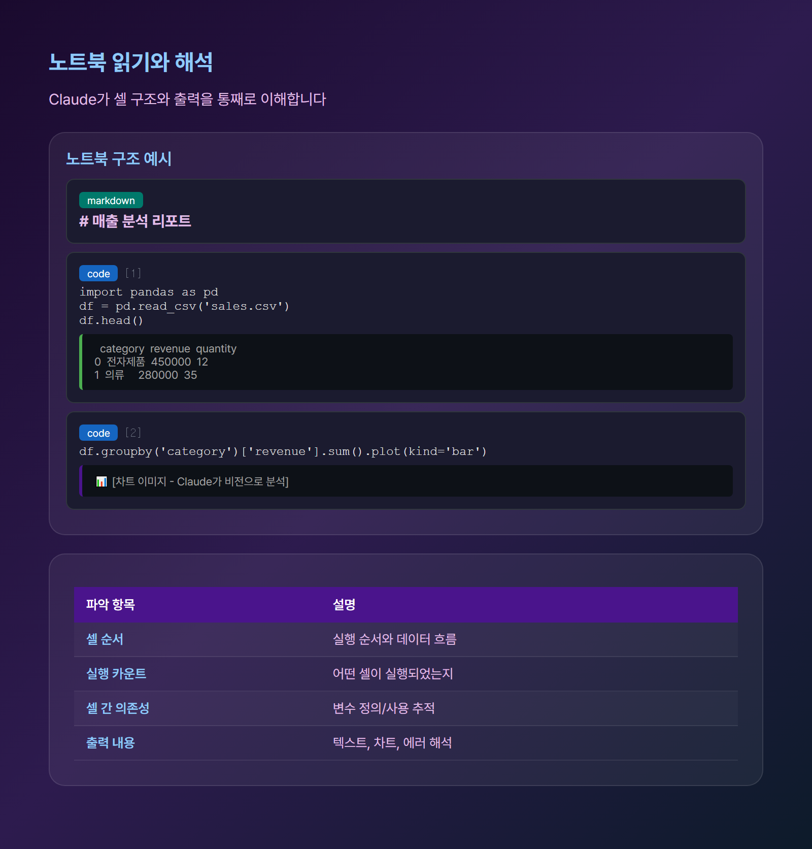 Claude Code는 Jupyter 노트북(.ipynb)을 네이티브로 지원합니다. 노트북의 JSON 구조를 직접 파싱해서 셀을 읽고, 수정하고, 출력(차트/테이블/에러)을 해석합니다.