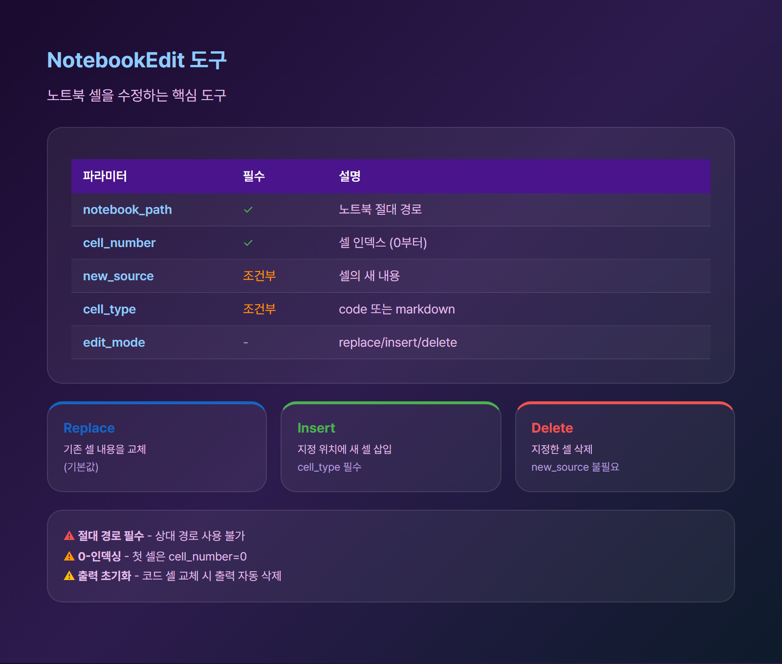 NotebookEdit는 Claude가 Jupyter 노트북의 셀을 수정하는 전용 도구입니다.
