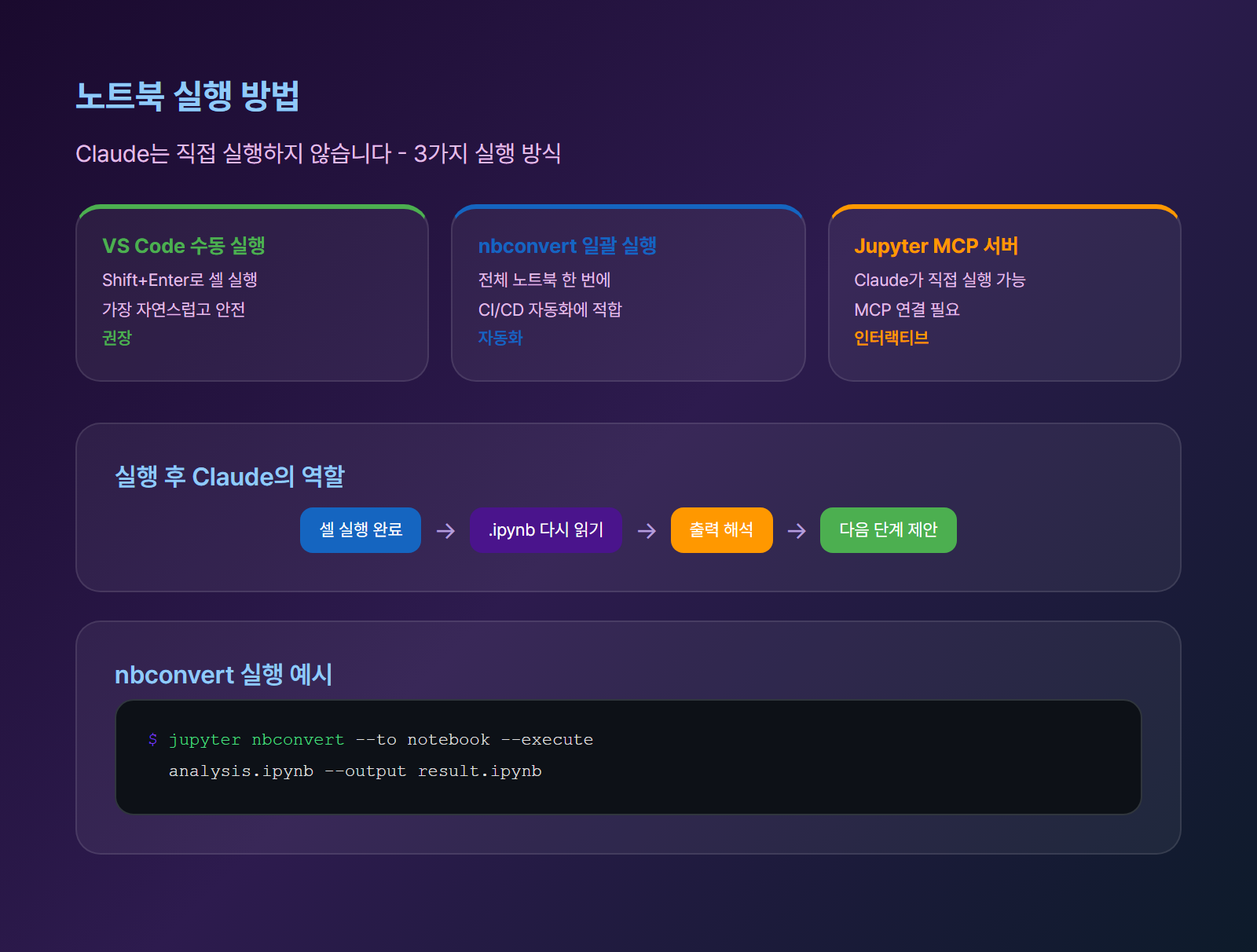 A: 기본적으로는 불가합니다. VS Code에서 수동 실행하거나, nbconvert로 일괄 실행하거나, Jupyter MCP 서버를 연결하면 가능합니다.