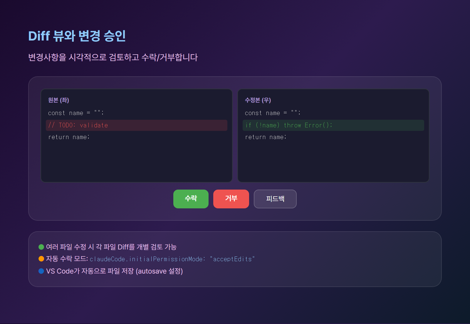 ├── Diff 뷰 (변경사항 검토)