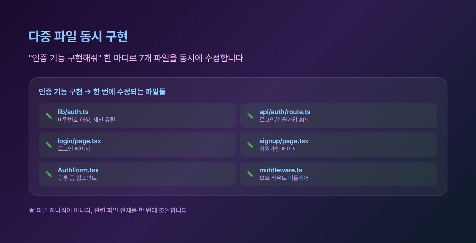 └── 다중 파일 동시 수정 (컴포넌트, API, DB)