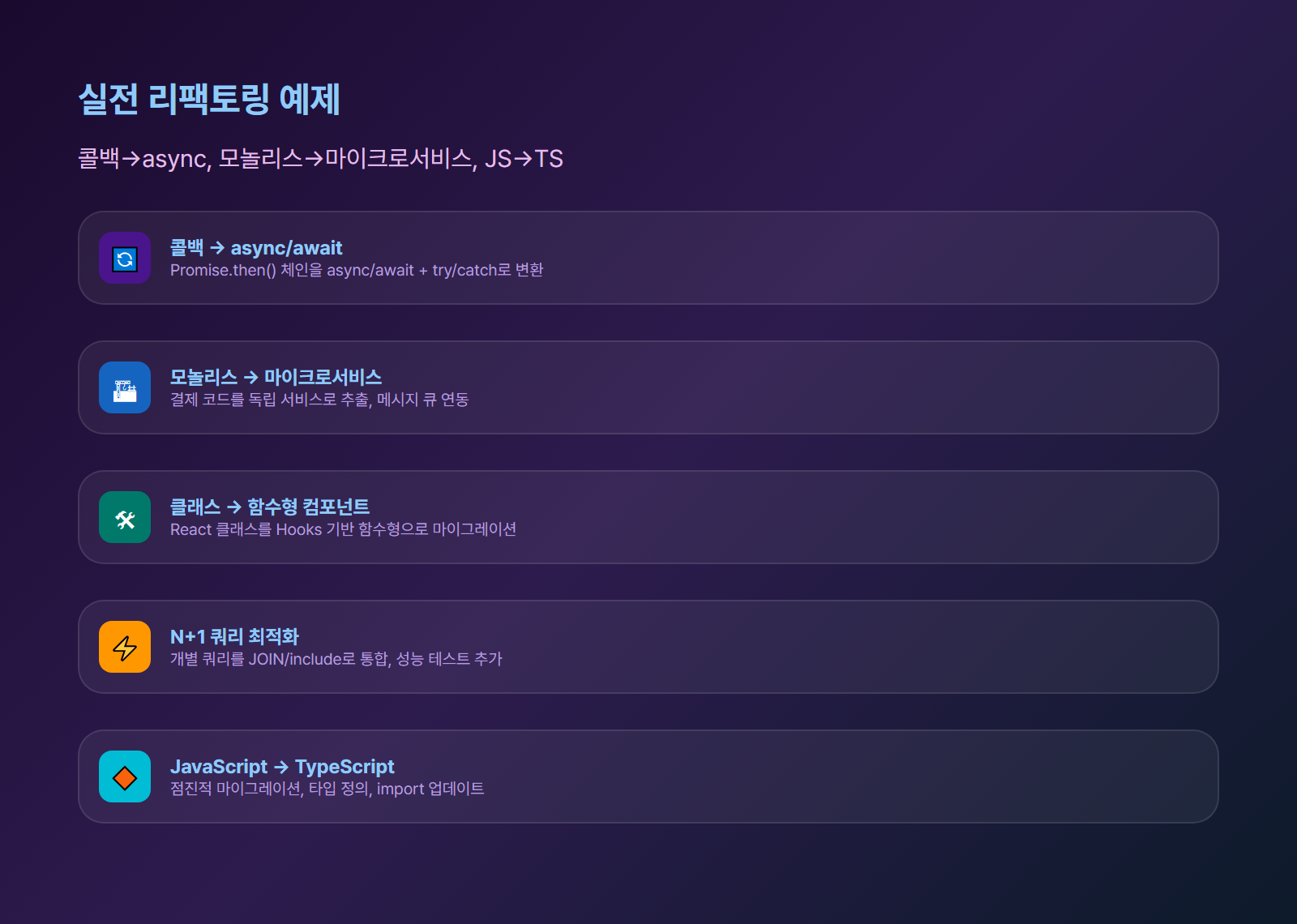 A: 네. JavaScript→TypeScript, 클래스→함수형, 콜백→async/await 등의 점진적 마이그레이션이 가능합니다. Plan 모드로 우선순위를 정하고 파일 단위로 점진적으로 진행합니다.