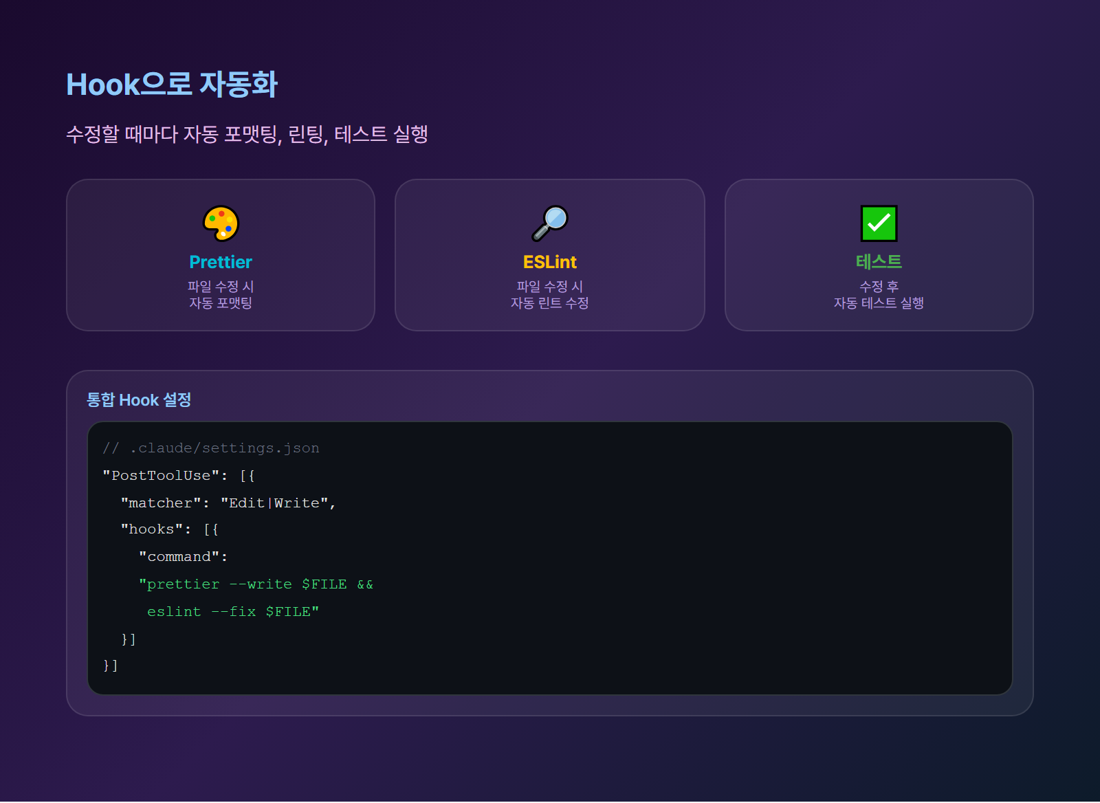 | Hook 연동 | 수정 후 자동 포맷팅/린팅 |