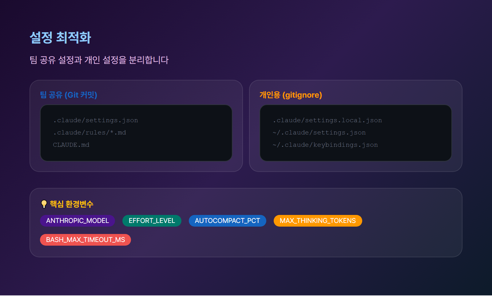 A: .claude/settings.json은 Git에 커밋하여 팀 공유, .claude/settings.local.json은 gitignore로 개인 설정에 사용하세요.