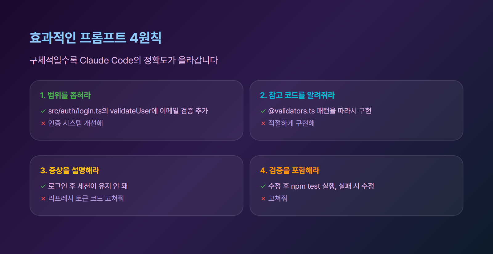 | 구체적으로 지시하라 | 범위, 파일, 검증 방법을 명시 |